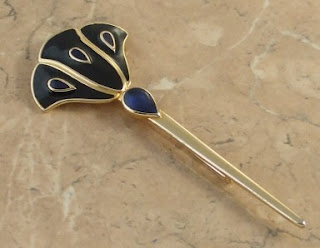 This morning we were adding a very stylish vintage enamel brooch from the Australian company Barcs. This brooch is inspired by the Art Deco period but was produced in the 1980s. Enameled in black with a blue center onto a gold tone setting. This nice quality brooch however is very similar to a Monet brooch that was made and is part of a jewellery set release during the 80s.