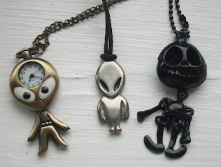 Alien shaped figural jewellery was more difficult to find. Most was on the cheaper end and a little tacky. This is just 4 necklaces found. All new jewellery and all via Ebay.
