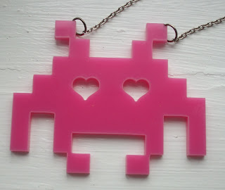 Who hasn't played Space Invaders? This is a very large alien necklace from a place called "Helpless Romantic" from the 1980s. This pink plastic Space Invader pendant is about 4 1/2 inches wide. Helpless Romantic has since folded, but for more perspex jewellery that is fun and would be great to collect try Tatty Devine.